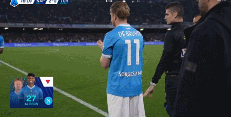 第79分钟,换人调整,德布劳内替补登场,换下阿利松-桑托斯